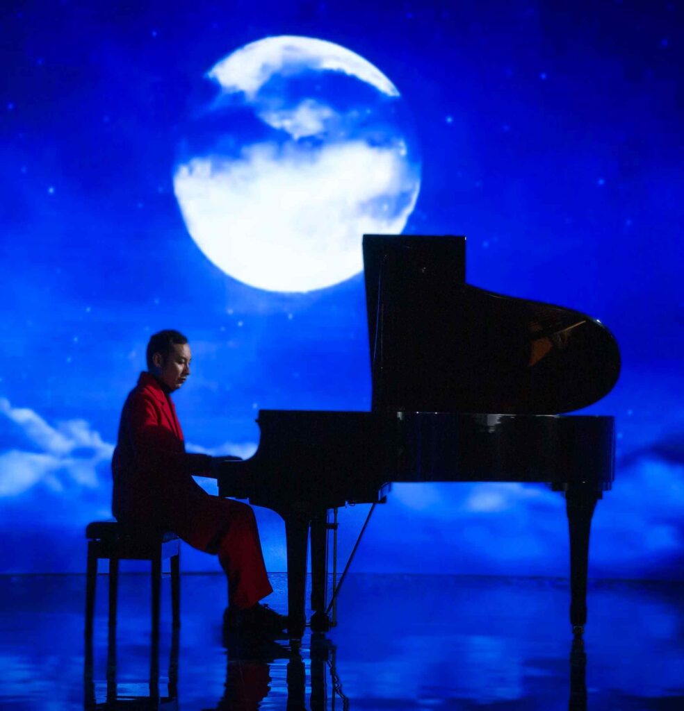 不再只為他人伴奏,他選擇走向舞台中央,以曲詞創作與自彈自唱展現個人魅力。 No longer content to accompany others, he chooses to step into the spotlight, showcasing his individuality through songwriting and self‑accompanied performance.
